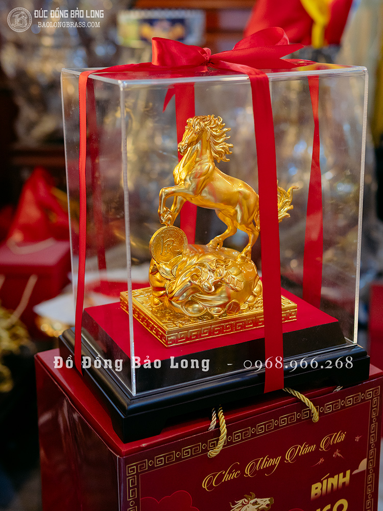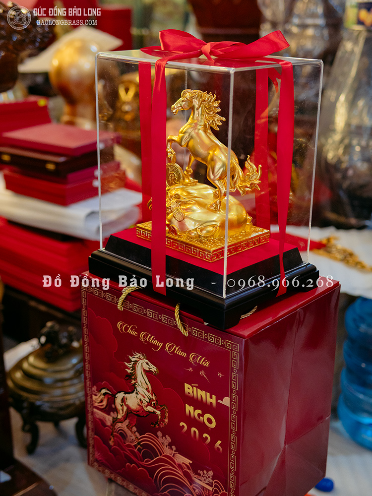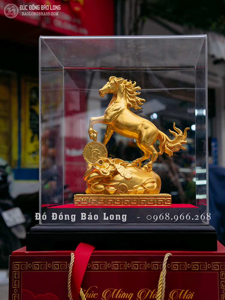 Sản phẩm có chiều cao 23cm, đi kèm đế trưng bày chắc chắn và hộp mica cao cấp, phù hợp làm quà tặng phong thủy, quà biếu đối tác, khách hàng hoặc trưng bày tại phòng khách, bàn làm việc. Cùng tìm hiểu chi tiết mẫu hộp quà tặng tượng Ngựa túi tiền dát vàng trong bài chia sẻ dưới đây nhé.
